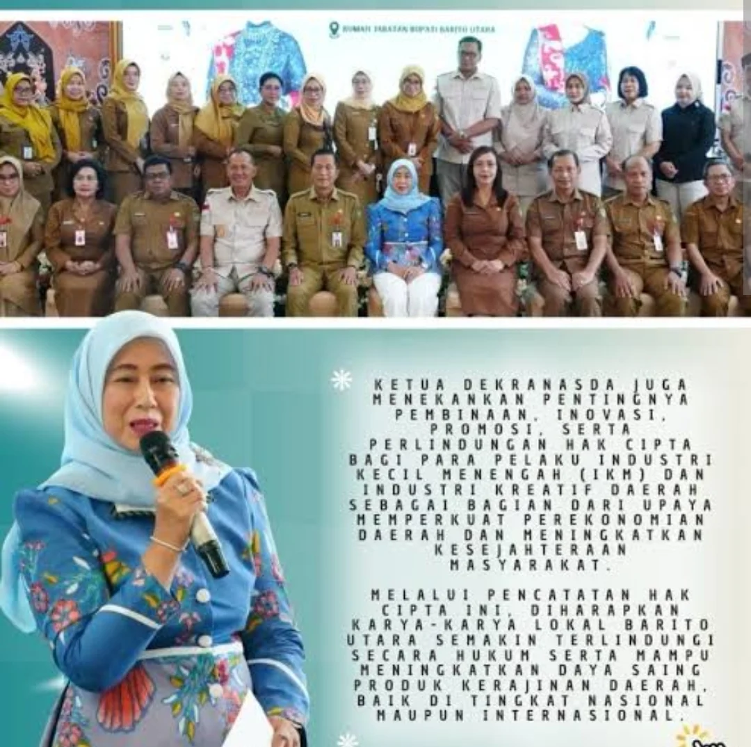 AspirasiRakyat.Id Barito Utara– Pemerintah Kabupaten Barito Utara terus mendorong perlindungan terhadap kekayaan intelektual produk daerah sebagai bagian dari penguatan ekonomi kreatif dan pengembangan usaha mikro, kecil, dan menengah (UMKM). Hal tersebut ditandai dengan penyerahan Sertifikat Pencatatan Hak Cipta kepada Ketua Dekranasda Barito Utara, Hj. Maya Savitri Shalahuddin, di Rumah Jabatan Bupati Barito Utara, Sabtu, 3 Januari 2026.